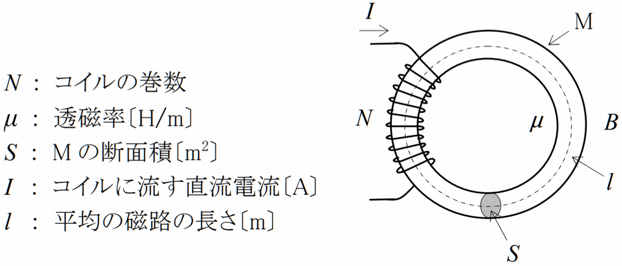 次の記述は、図に示す環状鉄心 M 内にできる磁束密度 B について述べたものである。[ ]内に入れるべき字句の正しい組合せを下の番号から選べ。ただし、磁気回路に磁気飽和及び漏れ磁束はないものとする。